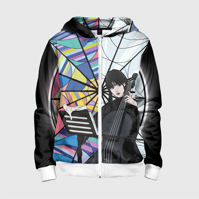 Детская толстовка 3D на молнии Уэнсдэй играет на виолончели на фоне окна