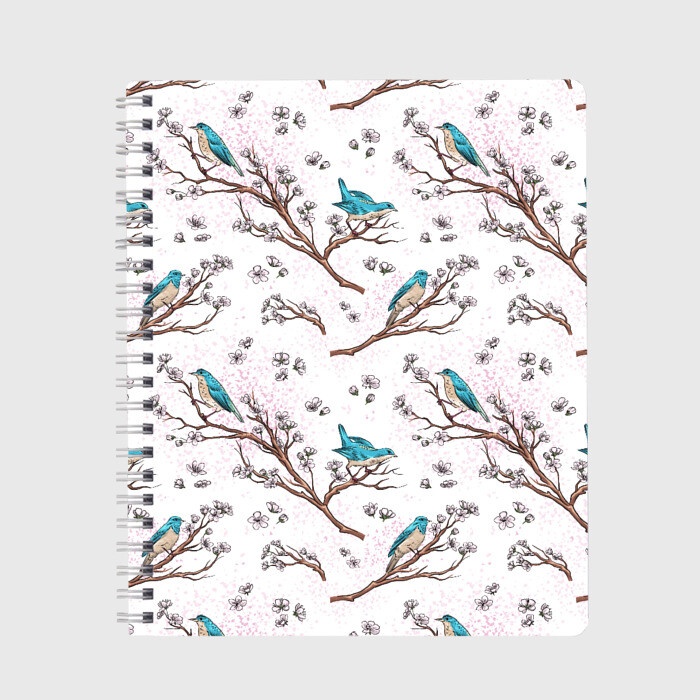 Тетрадь с принтом Птички весной на ветках Сакуры