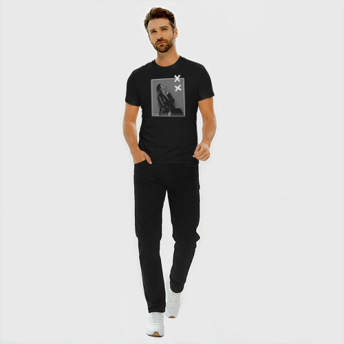 Футболка из плотного хлопка с добавлением лайкры: за счет этого ткань немного тянется, хорошо держит форму и комфортно садится по фигуре. Силуэт приталенный, ориентирован на мужчин с широкими плечами и узкими бедрами. Понравится тем, кто хочет подчеркнуть достоинства своего торса и любит футболки “по фигуре”.
