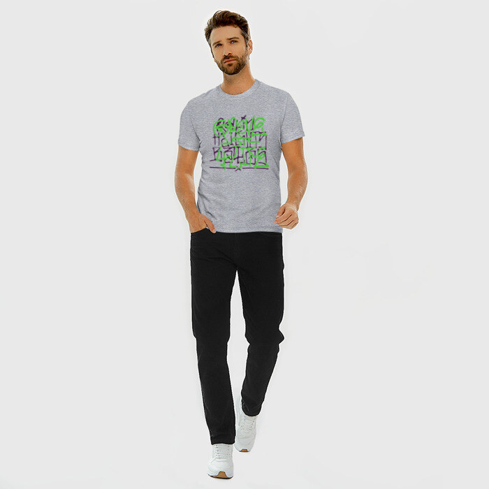 Футболка из плотного хлопка с добавлением лайкры: за счет этого ткань немного тянется, хорошо держит форму и комфортно садится по фигуре. Силуэт приталенный, ориентирован на мужчин с широкими плечами и узкими бедрами. Понравится тем, кто хочет подчеркнуть достоинства своего торса и любит футболки “по фигуре”.