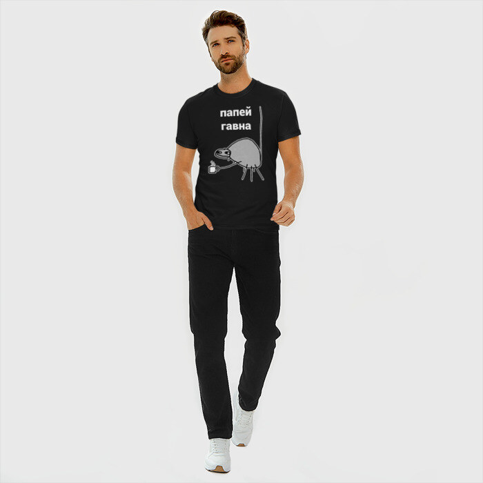 Футболка из плотного хлопка с добавлением лайкры: за счет этого ткань немного тянется, хорошо держит форму и комфортно садится по фигуре. Силуэт приталенный, ориентирован на мужчин с широкими плечами и узкими бедрами. Понравится тем, кто хочет подчеркнуть достоинства своего торса и любит футболки “по фигуре”.