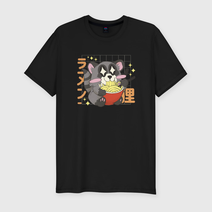 Мужская футболка хлопок Slim с принтом Каваи енот ест рамен