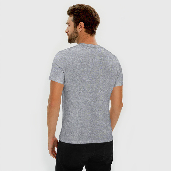 Футболка из плотного хлопка с добавлением лайкры: за счет этого ткань немного тянется, хорошо держит форму и комфортно садится по фигуре. Силуэт приталенный, ориентирован на мужчин с широкими плечами и узкими бедрами. Понравится тем, кто хочет подчеркнуть достоинства своего торса и любит футболки “по фигуре”.