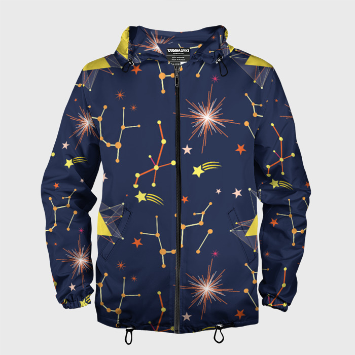 Свободная легкая ветровка с капюшоном, застегивается на молнию. Сшита из плотной ткани, по всей поверхности которой наносится принт. Можно заказать со своим дизайном.