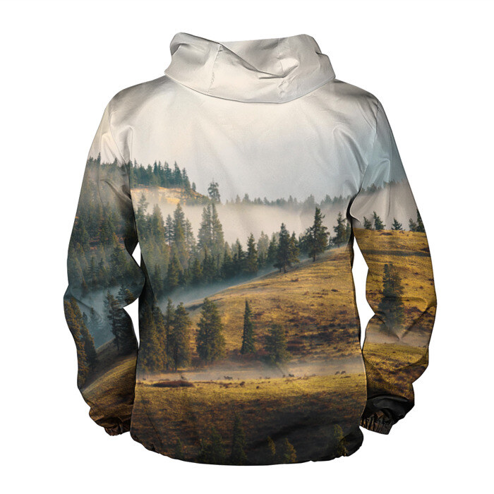 Свободная легкая ветровка с капюшоном, застегивается на молнию. Сшита из плотной ткани, по всей поверхности которой наносится принт. Можно заказать со своим дизайном.