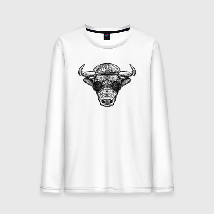 Мужской лонгслив хлопок с принтом Бык в очках и кепке