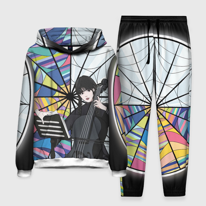 Мужской костюм 3D (с толстовкой) УЭНСДЭЙ ИГРАЕТ НА ВИОЛОНЧЕЛИ НА ФОНЕ ОКНА