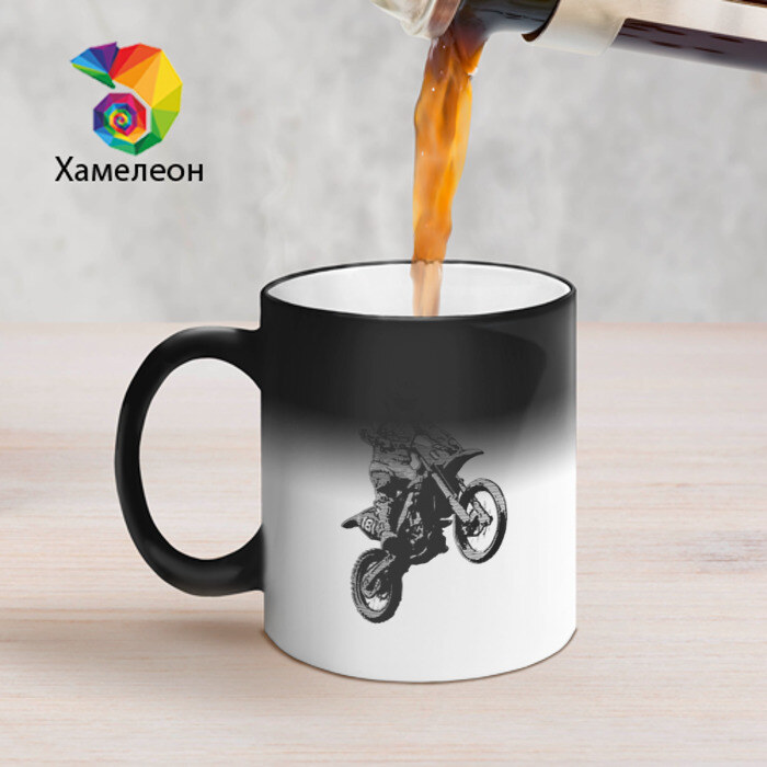 Кружка-сюрприз: пока в ней холодная вода, она будет оставаться однотонной, а когда нальете горячую — проявится принт. Принт начинает проявляться буквально через 10 секунд, в течение минуты он будет виден полностью. Когда остынет, кружка вернется к изначальному цвету.