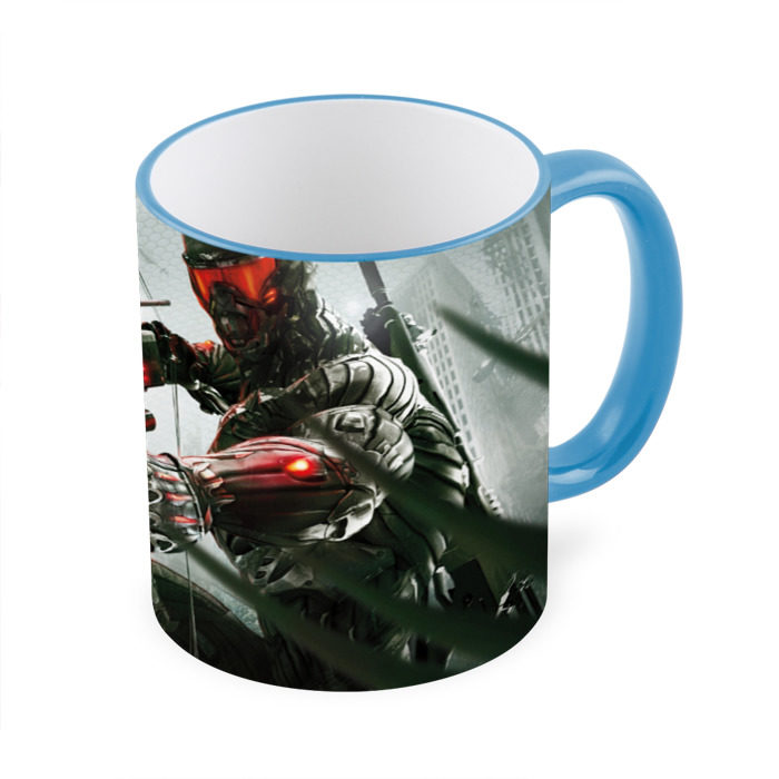 Кружка с принтом, который наносится по всей внешней поверхности, кроме прямоугольника у ручки. У кружки цветной ободок сверху и ручка. Можно заказать со своим дизайном.