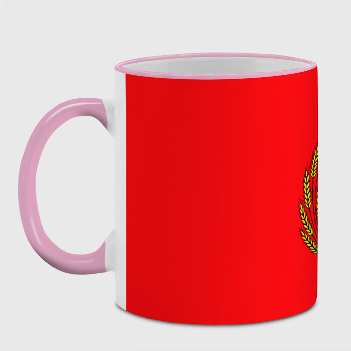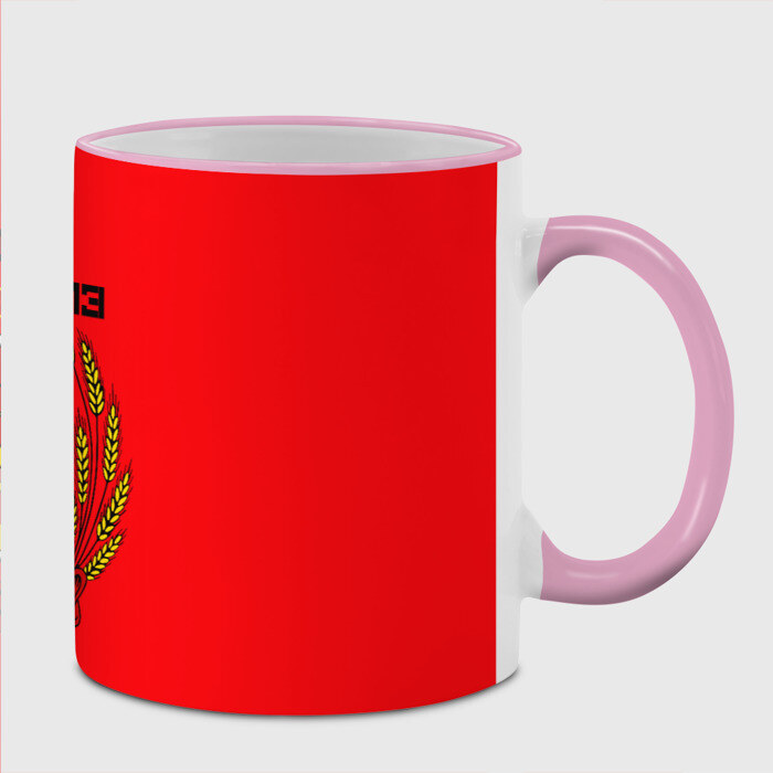 Кружка с принтом, который наносится по всей внешней поверхности, кроме прямоугольника у ручки. У кружки цветной ободок сверху и ручка. Можно заказать со своим дизайном.