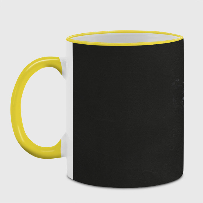 Кружка с принтом, который наносится по всей внешней поверхности, кроме прямоугольника у ручки. У кружки цветной ободок сверху и ручка. Можно заказать со своим дизайном.