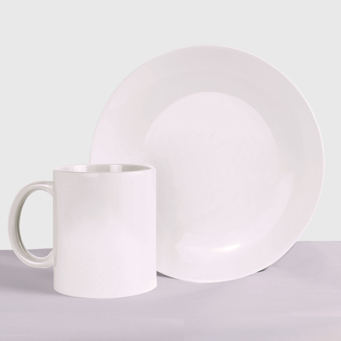 Кружка изготовлена из высококачественной белой керамики. Тарелка изготовлена из фарфора. Принт наносится на бока кружки: два изображения или только с одной стороны. На тарелку принт наносится на плоскую часть.