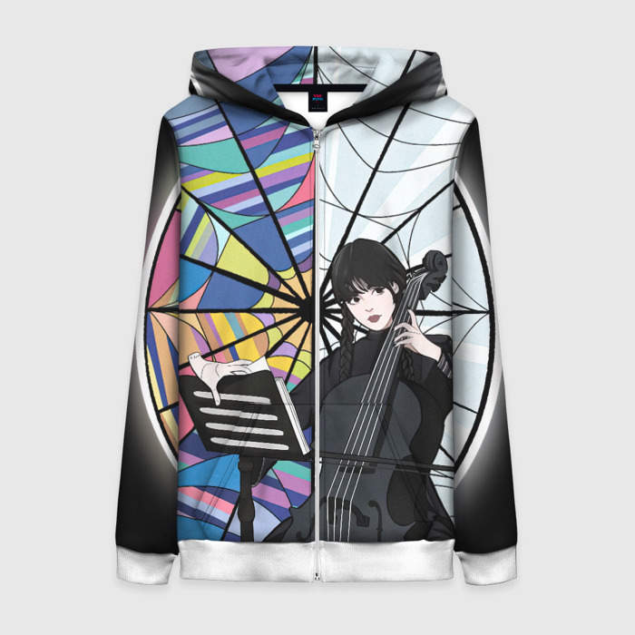 Женская толстовка 3D на молнии с принтом Уэнсдэй играет на виолончели на фоне окна