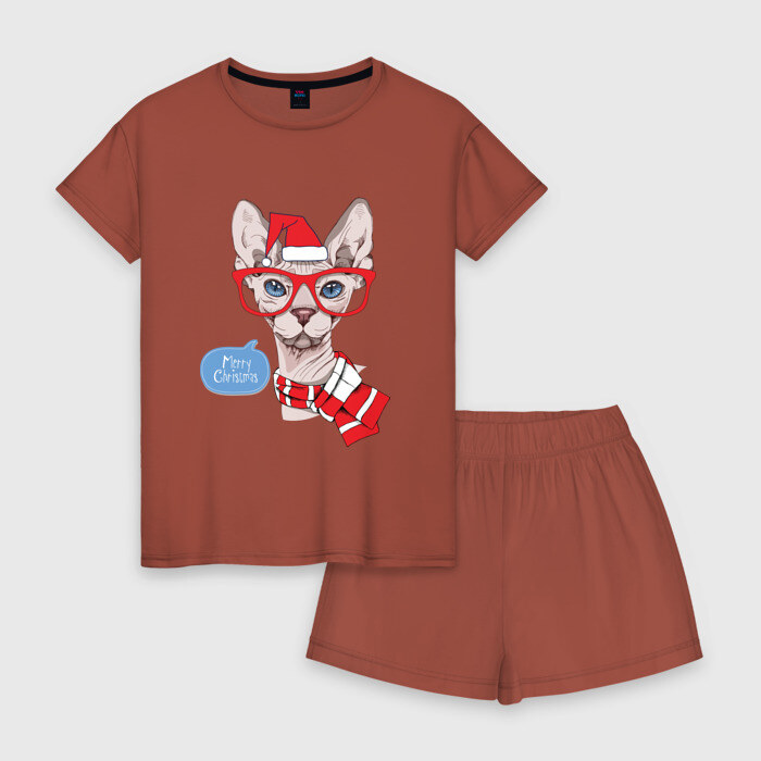Женская пижама с шортиками хлопок с принтом Рождественский сфинкс