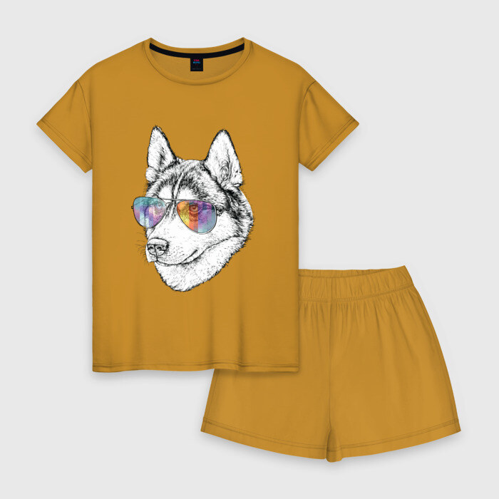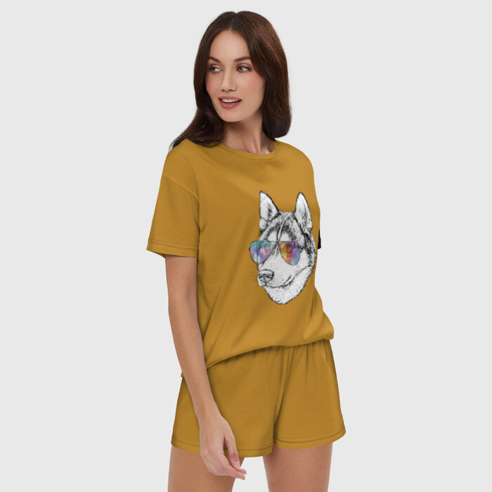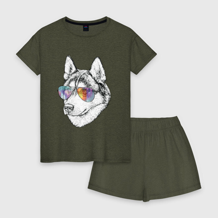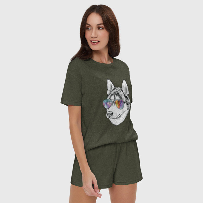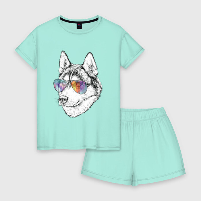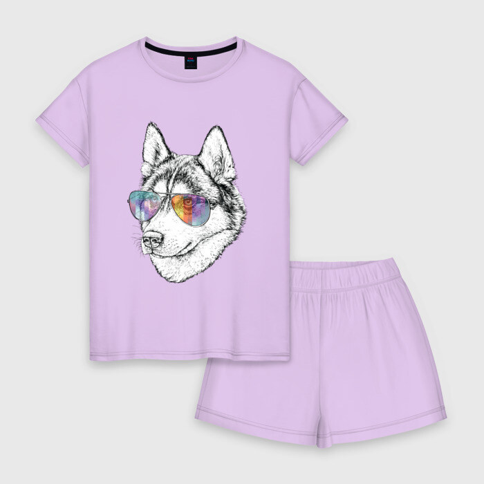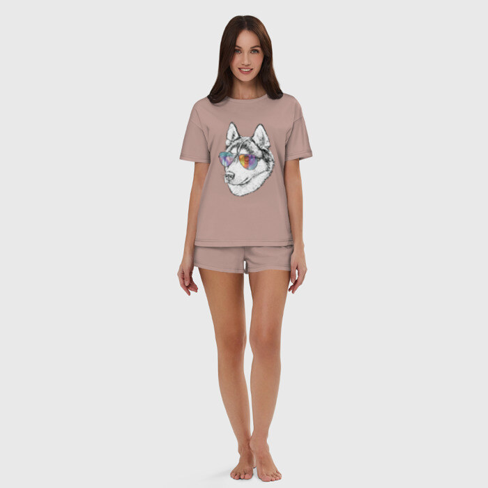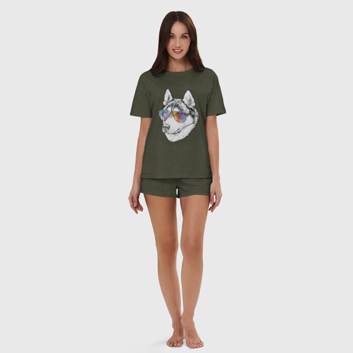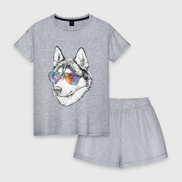 Женская пижама с шортиками хлопок с принтом Хаски в очках
