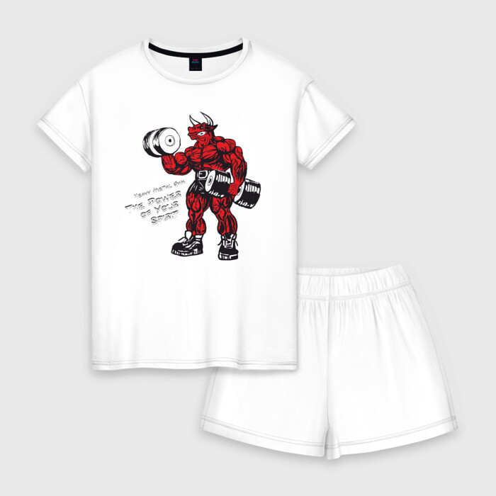 Женская пижама с шортиками хлопок с принтом Бодибилдинг Бык Гантели HMGYM