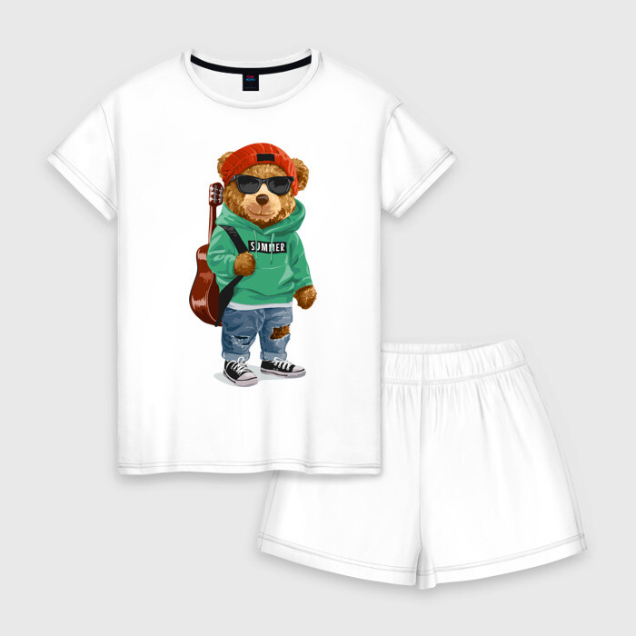 Женская пижама с шортиками хлопок с принтом Медведь с гитарой