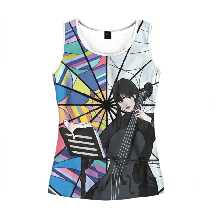 Женская майка 3D Уэнсдэй играет на виолончели на фоне окна