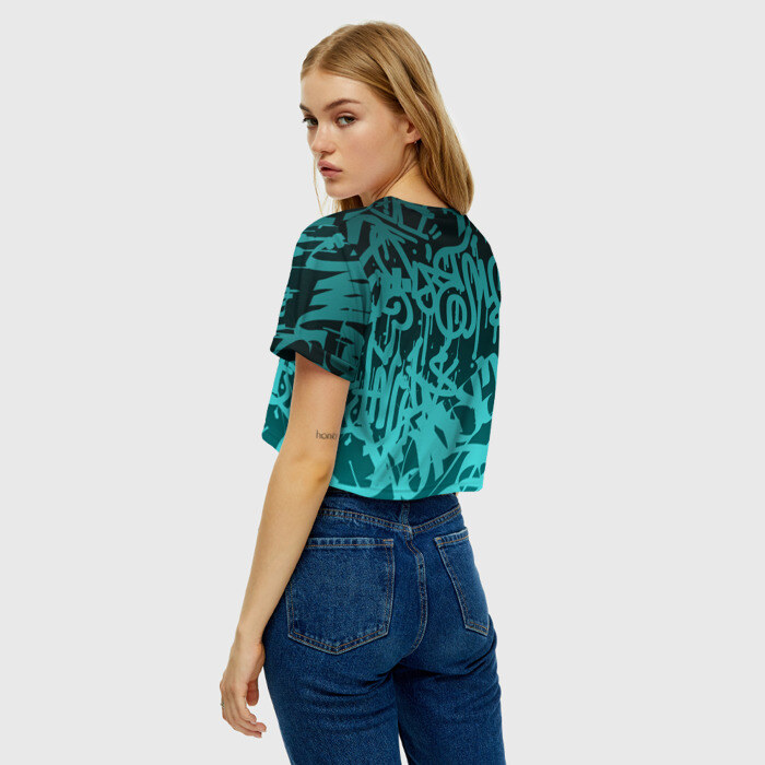 Укороченная футболка, которая открывает талию, пупок и живот. Футболка сшита из мягкой синтетической ткани, по всей поверхности которой наносится принт. Можно сделать со своим дизайном.