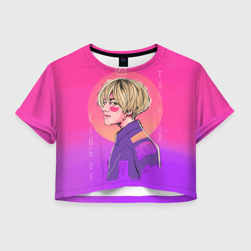 Укороченная футболка, которая открывает талию, пупок и живот. Футболка сшита из мягкой синтетической ткани, по всей поверхности которой наносится принт. Можно сделать со своим дизайном.
