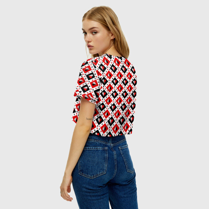 Укороченная футболка, которая открывает талию, пупок и живот. Футболка сшита из мягкой синтетической ткани, по всей поверхности которой наносится принт. Можно сделать со своим дизайном.