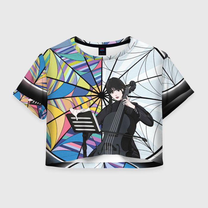 Женская футболка Crop-top 3D Уэнсдэй играет на виолончели на фоне окна