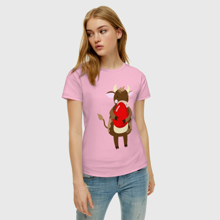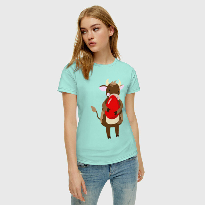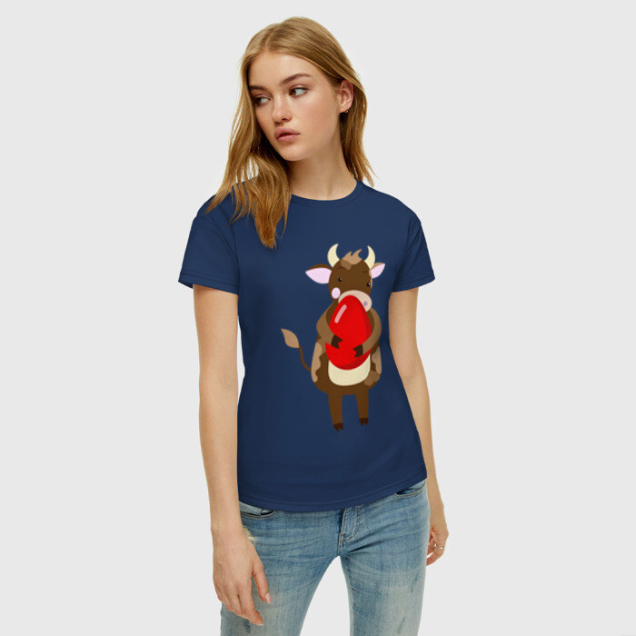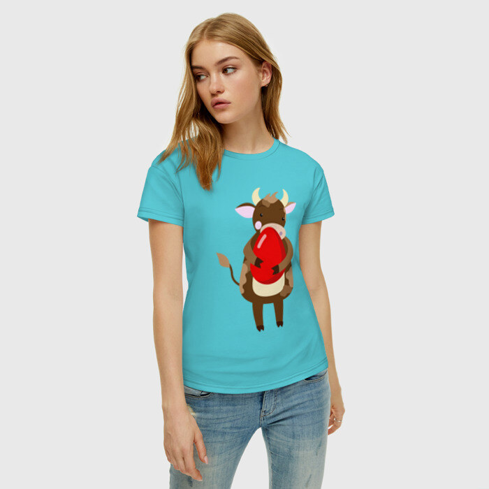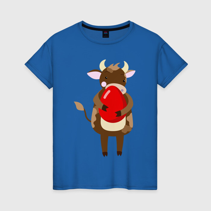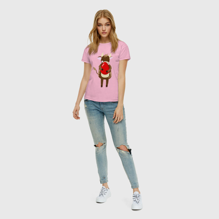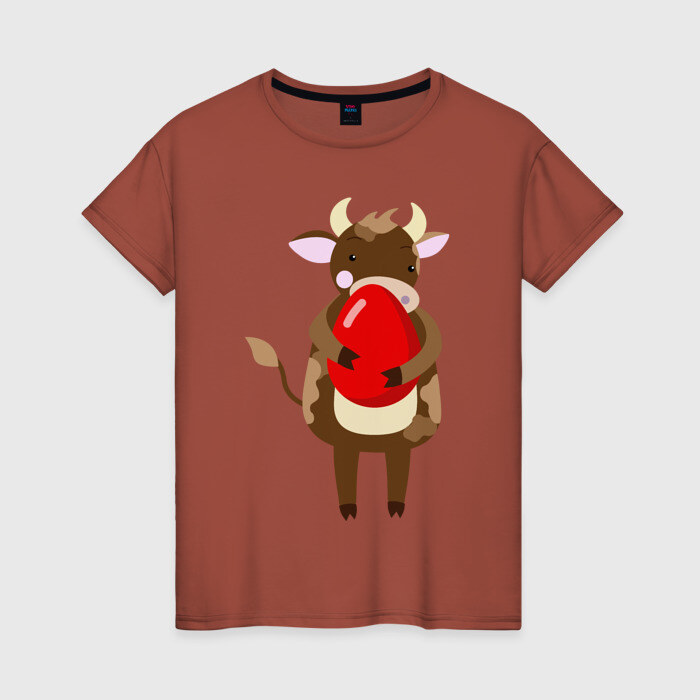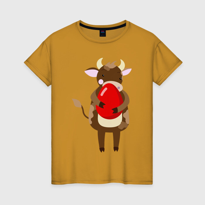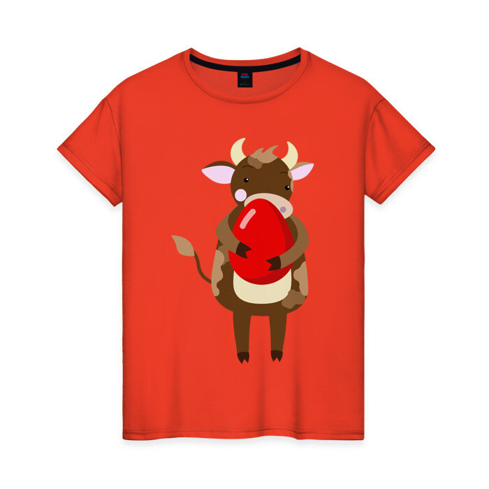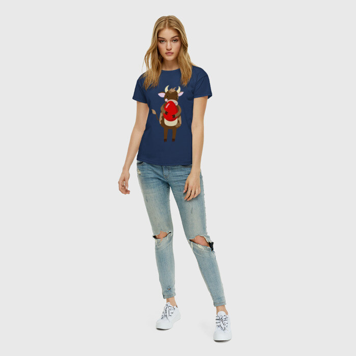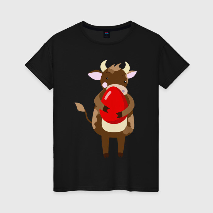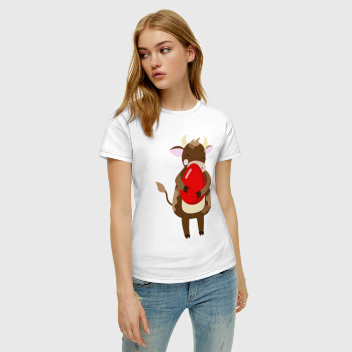 Женская футболка хлопок с принтом Новогодний бык с киндером